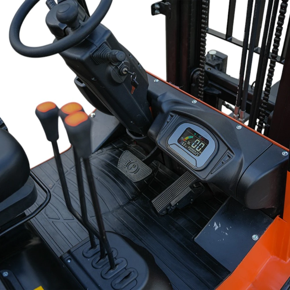 Прочные цельнолитые шины и четырёхколёсное исполнение делают погрузчик устойчивым на разных типах покрытий, включая бетон и асфальт. Радиус поворота 2200 мм и компактные габариты (длина с вилами 3300 мм, ширина 1096 мм) позволяют эффективно работать даже в стеснённых условиях склада.