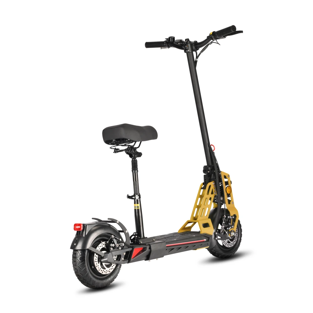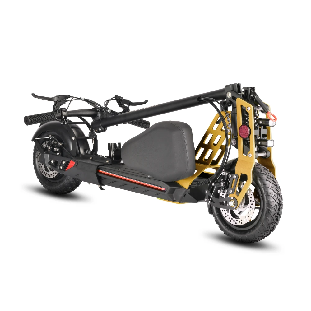 Алюминиевый сплав - это материал электросамоката, он легкий и прочный, в связи с чем его вес всего 23 килограмма, а на борт можно подняться с предельной массой в 125 килограмм. Вы сможете не только самостоятельно кататься, но и перевозить любые вещи, положив их с собой. Электромотор самоката позволит вам достигнуть максимальной скорости в 45 км/ч. Задний привод и надувные колеса с диаметром в 11 дюймов позволят вам передвигаться с максимальным комфортом и чувством защищенности.
