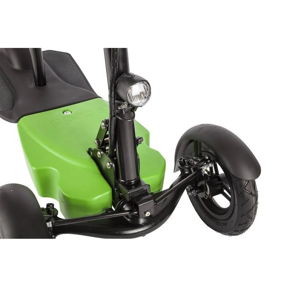 Электросамокат Eltreco Scuddy Light отличается оригинальной конструкцией, ведь производитель оснастил его тремя колёсами - двумя передними и одним задним. За счёт этого самокат более устойчив во время движения и совершения различных манёвров. Надувные 10-дюймовые колеса с глубоким протектором обеспечивают отличное сцепление и компенсируют неровности дорожного покрытия. Это дает возможность передвигаться не только по гладкому асфальту, но и по грунтовым дорогам и даже лесным тропинкам. Габариты самоката позволяют ездить по тротуарам, минуя утомительные автомобильные пробки. Специальный звуковой сигнал предупредит пешеходов о приближающемся транспорте. Данная модель уверенно разгоняется до 25 км\час и способна преодолеть до 25 километров пути на одном заряде батареи. Во время длительной поездки райдер может воспользоваться удобным сиденьем. В темное время суток на помощь придет яркая светодиодная фара. На ряду с задними стоп-сигналами она обеспечивает безопасность движения, делая самокат заметным для других участников дорожного движения. Управление на данной модели настолько интуитивно понятное, что с ним справится даже ребенок. Электросамокат Eltreco Scuddy Light имеет складную конструкцию, благодаря чему его можно легко перевозить в автомобиле или общественном транспорте.