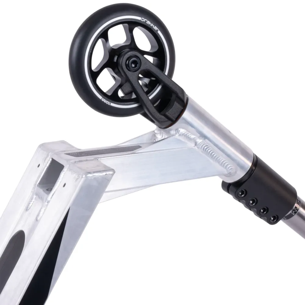 Прочный руль из стали с внешним диаметром 34.9 мм, высотой 615 мм и шириной 540 мм обеспечивает надежное управление и комфорт даже при интенсивных тренировках. Вилка из алюминия с системой компрессии SCS отвечает за качественное гашение ударов, что особенно важно при выполнении прыжков и приземлений. Дека, также выполненная из алюминия, с интегрированной рулевой системой имеет оптимальные габариты: ширина 140 мм, длина 490 мм и футспейс 340 мм – все это способствует правильному распределению веса и стабильности в процессе катания.
